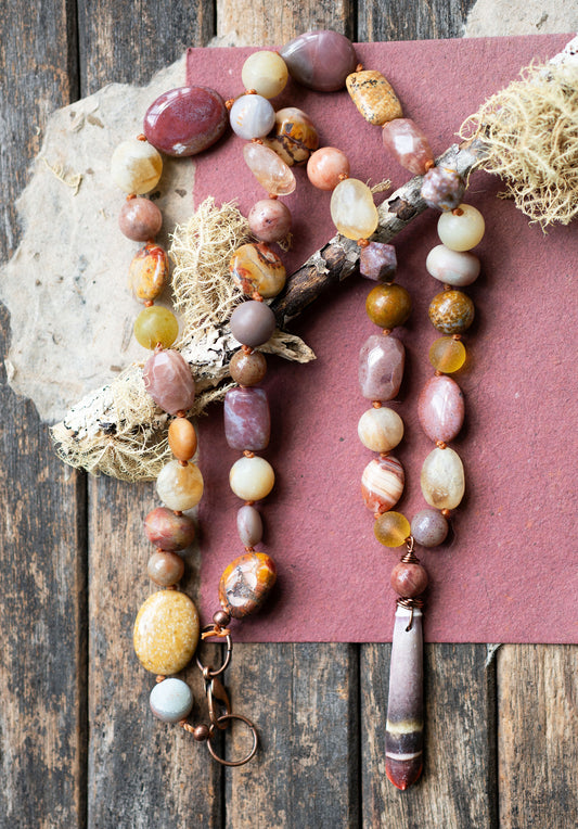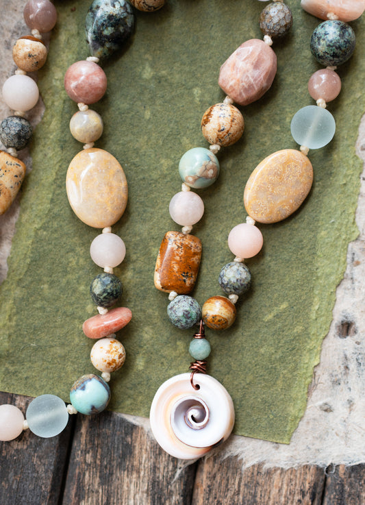 Beach Seashell Knotted Cord Amazonite Sunstone Gemstone Necklace