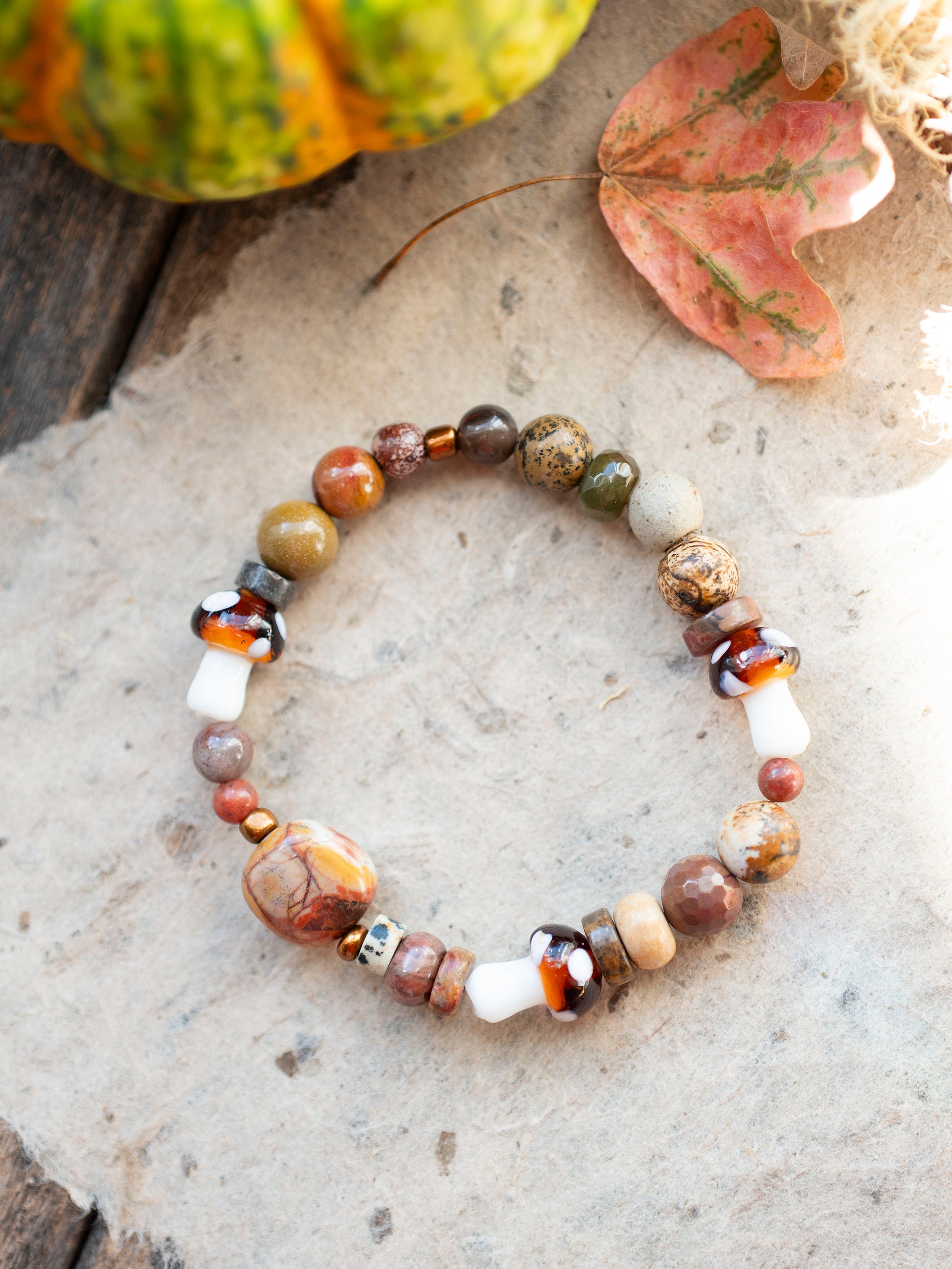 This autumn inspired design features amber colored lampwork glass mushrooms with a Bird's Eye Rhyolite focal and a mix of earthy gemstones jaspers and petrified wood beads on stretchy elastic beading cord. Bracelet measures 6.5 inches.