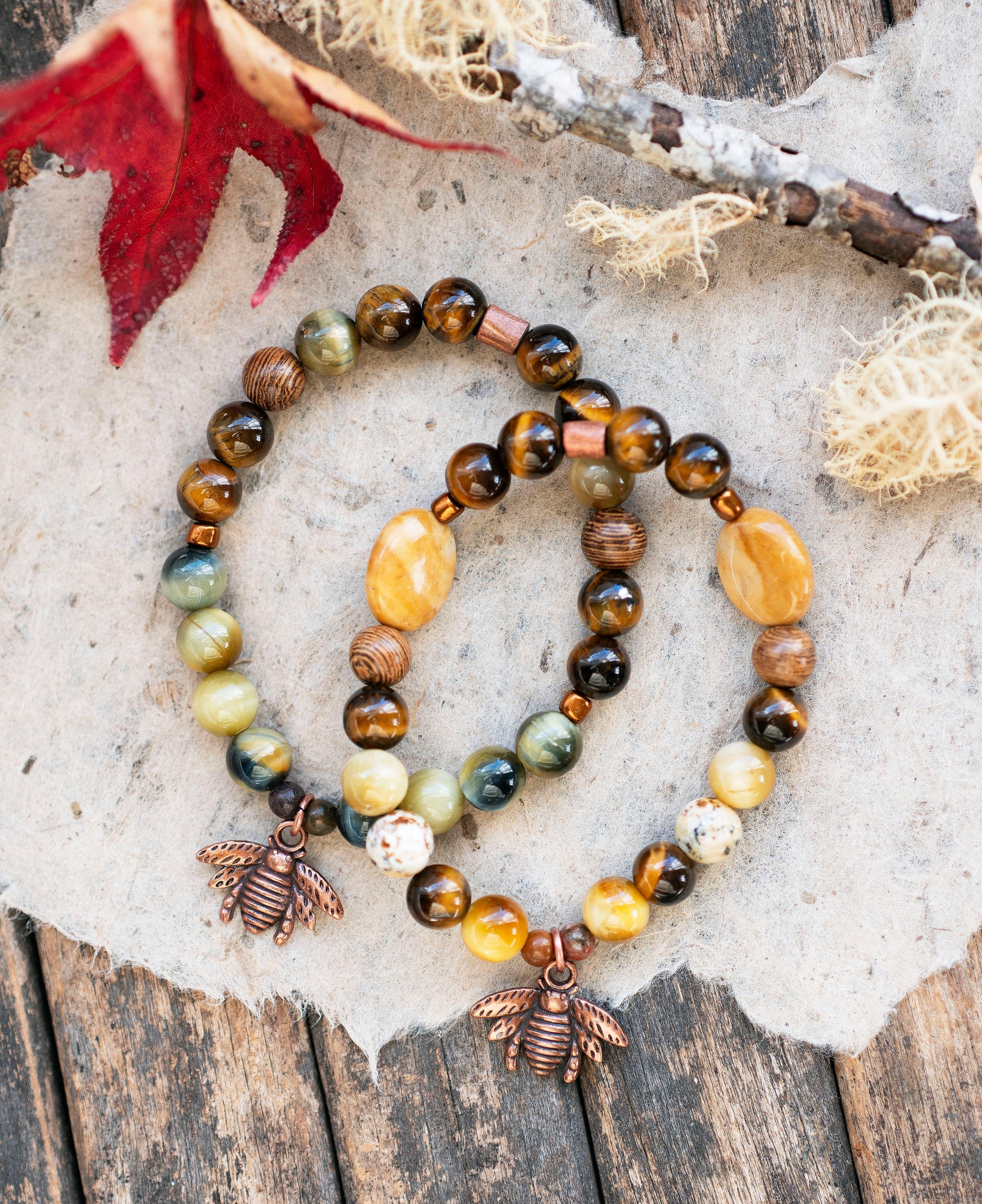 This nature inspired design features a copper bee charm with Yellow and Brown Tiger's Eye gemstones, Dendrite Opal gemstones and Yellow Polychrome Jasper ovals on stretchy elastic beading cord. Bracelet measures 7 inches (can resize upon request).