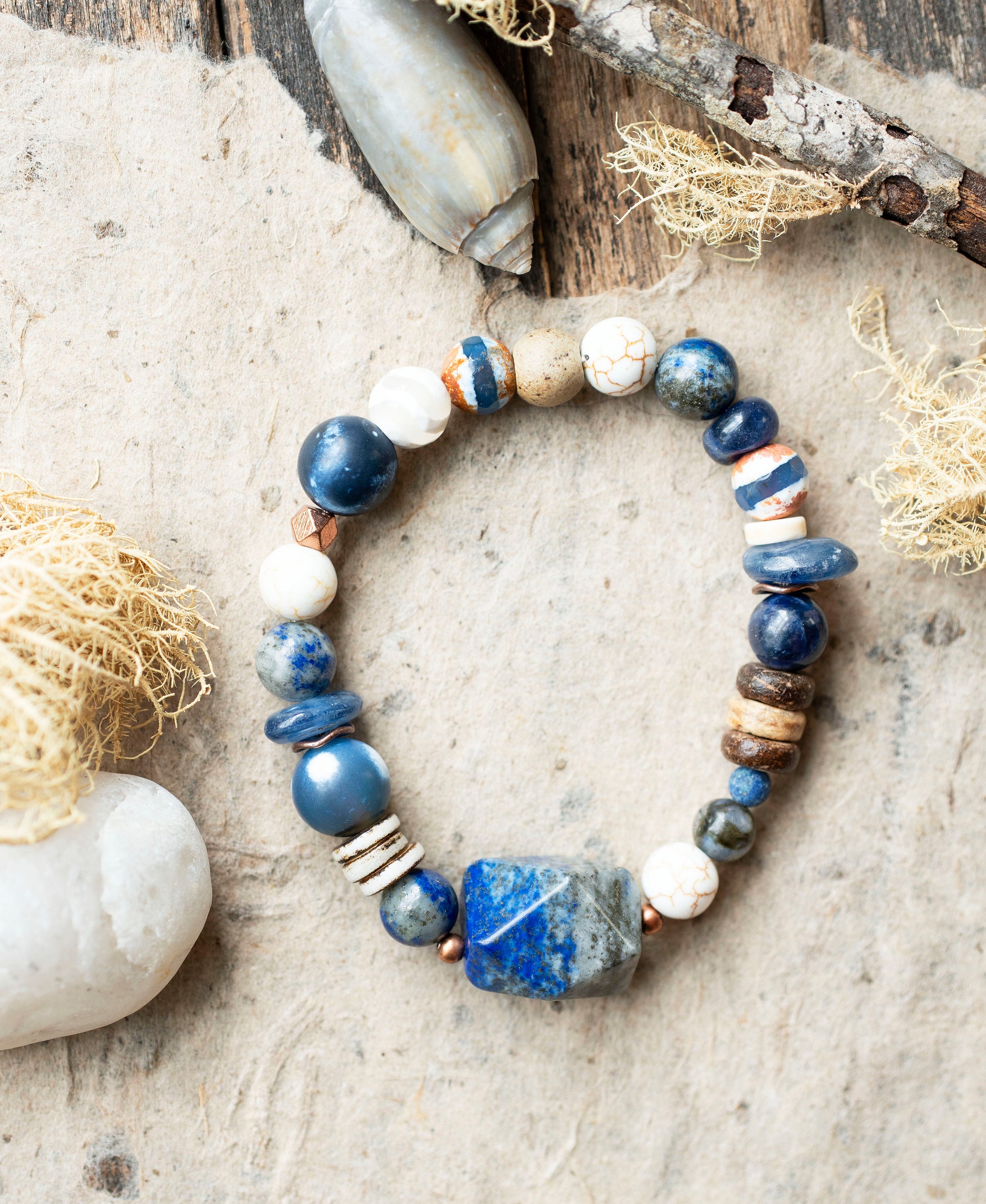 This nature inspired, calming design features a Lapis Lazuli focal bead with 8mm Lapis Lazuli rounds, 10mm Storm Agate rounds, Blue Kyanite beads, 8mm White Howlite rounds, 8mm white and blue striped Dzi Agate rounds, 4mm faceted Blue Aventurine beads, copper accent beads, coconut shell beads, rustic bone disc beads and ceramic beads all on stretchy elastic beading cord.
