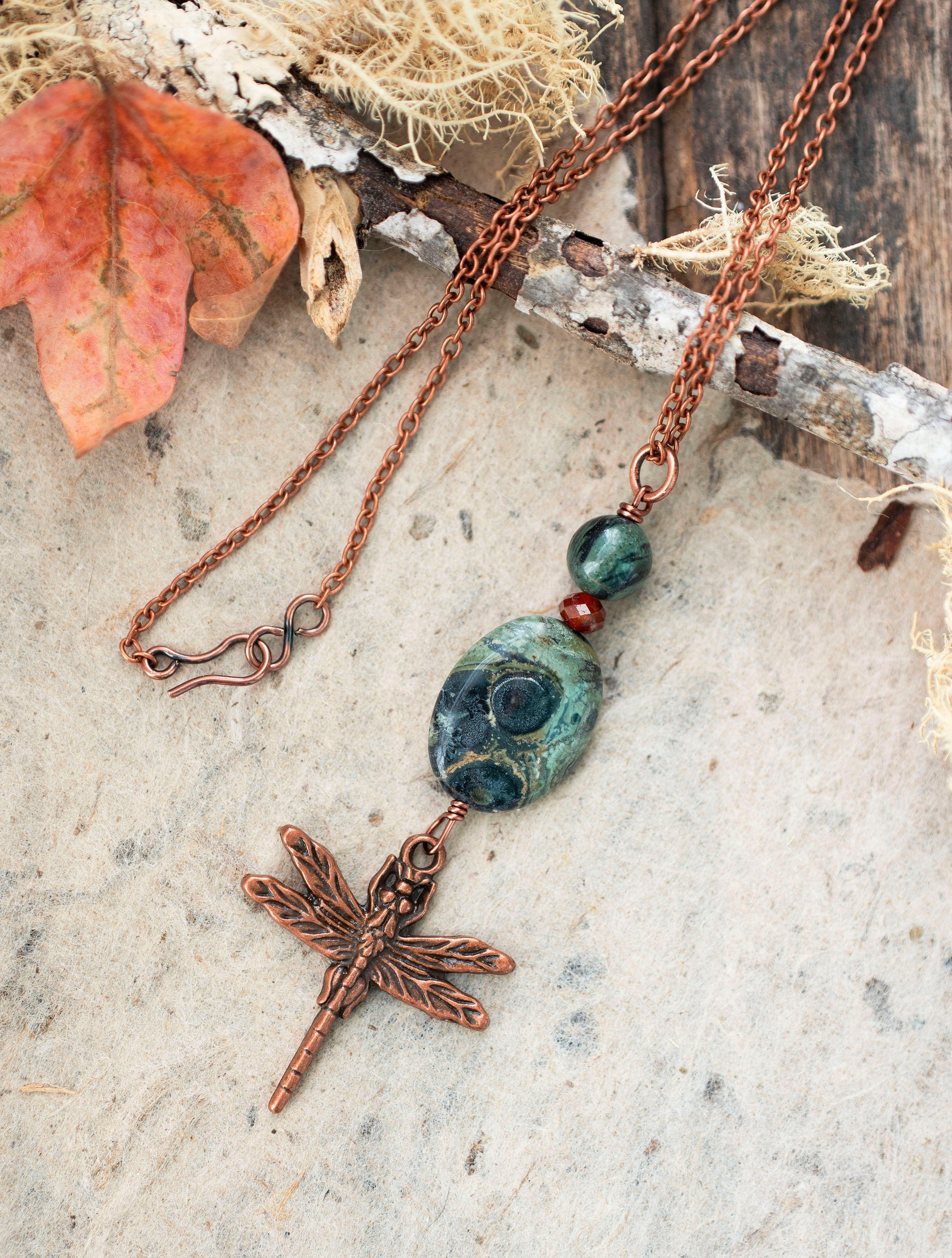 This nature inspired design features a copper dragonfly charm paired with a unique Kambaba Jasper focal bead, tiny hesssonite Garnet and round Kambaba Jasper bead on an antique copper chain with copper clasp. Chain measures 20 inches with a 3 inch pendant. (can shorten chain upon request)