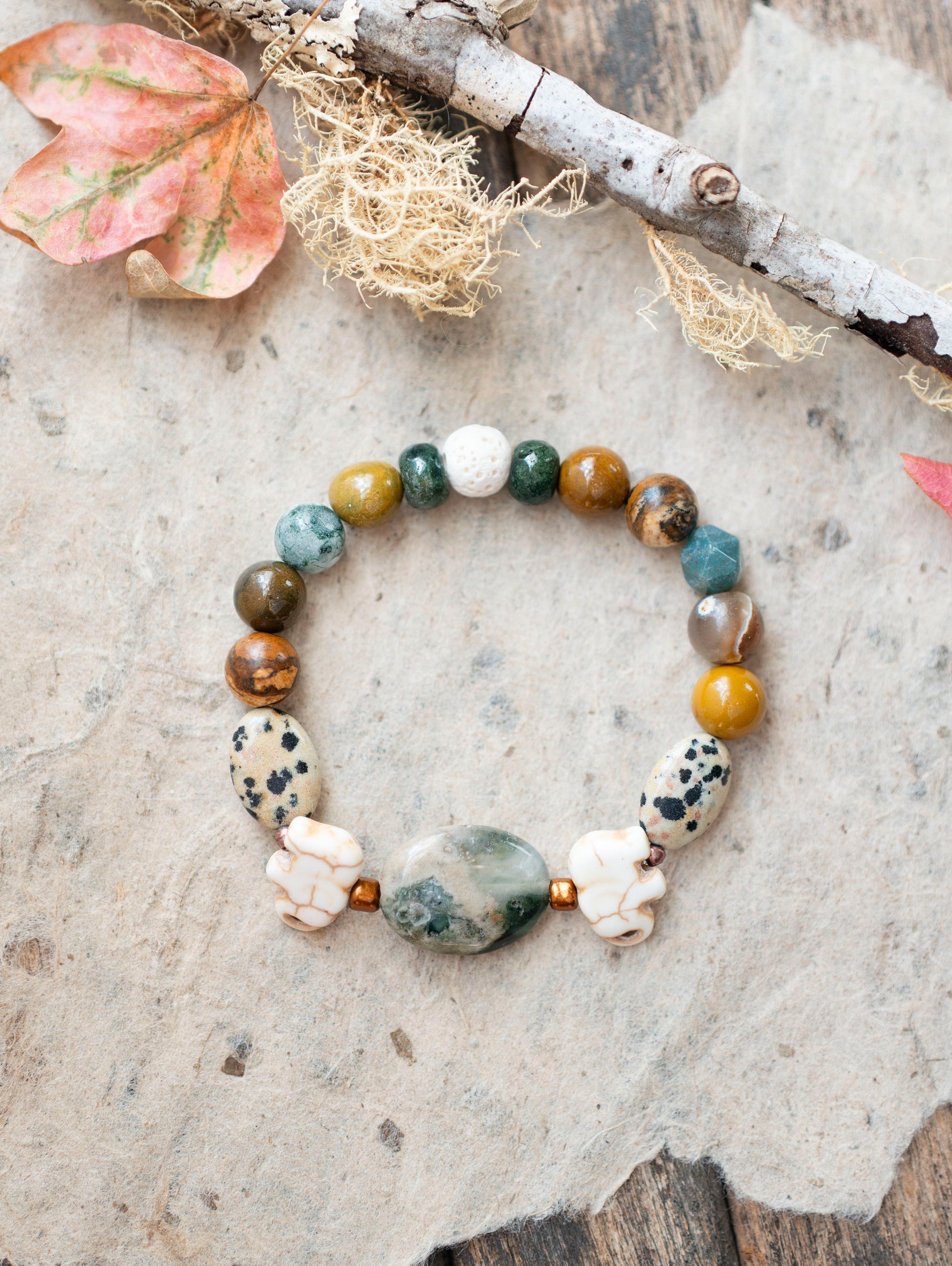This earthy design features an ocean jasper focal bead with white howlite elephant beads, dalmatian jasper ovals and 8mm round gemstone beads including picture jasper, mookaite jasper, moss agate and ivory lava stone beads on stretchy elastic beading cord. Bracelet measures 6.5 inches (happy to resize upon request).