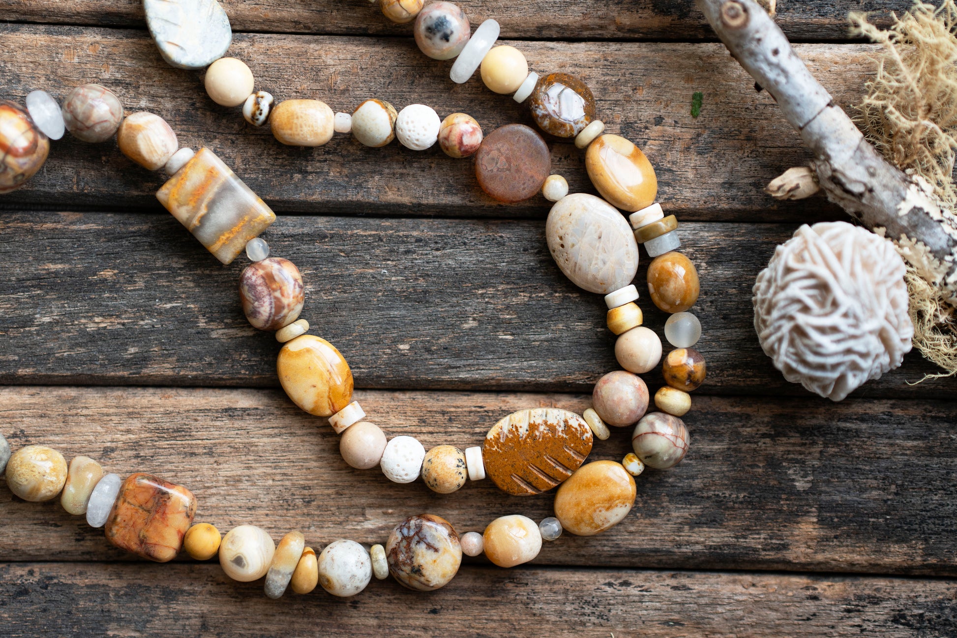 This rustic, nature inspired design features a river rock focal stone, Fossil Coral oval, Bird's Eye Rhyolite pebble beads, Crystal Quartz chip beads, Mushroom Jasper rounds, Polychrome Jasper ovals, wooden beads, Amazonite heishi beads, white Howlite disc beads, Crazy Lace Agate rectangle bead, Picture Jasper leaf and rounds, white Lava Stone beads, amber colored Czech glass circle and Bird's Eye Rhyolite rounds. Finished with a hammered antique brass toggle clasp. Necklace measures 24.5 inches. One of a kind design!